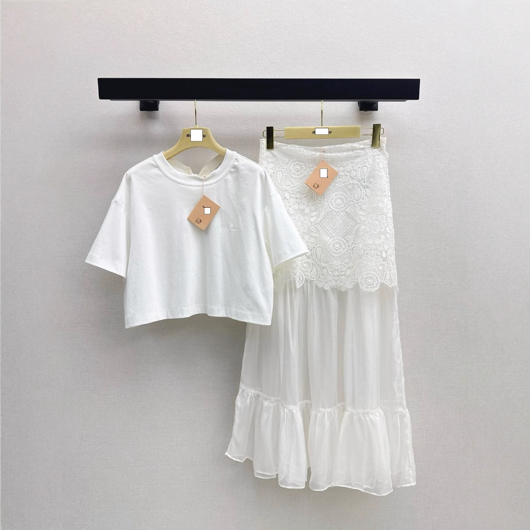 深圳南油25春夏高端女重工款度假风飘带小短款T恤+水溶花拼接半裙