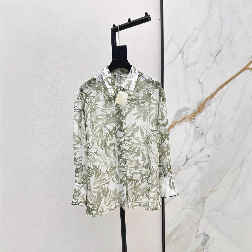 深圳南油25春夏高端女装优雅不规则腊叶印花度假风翻领衬衫