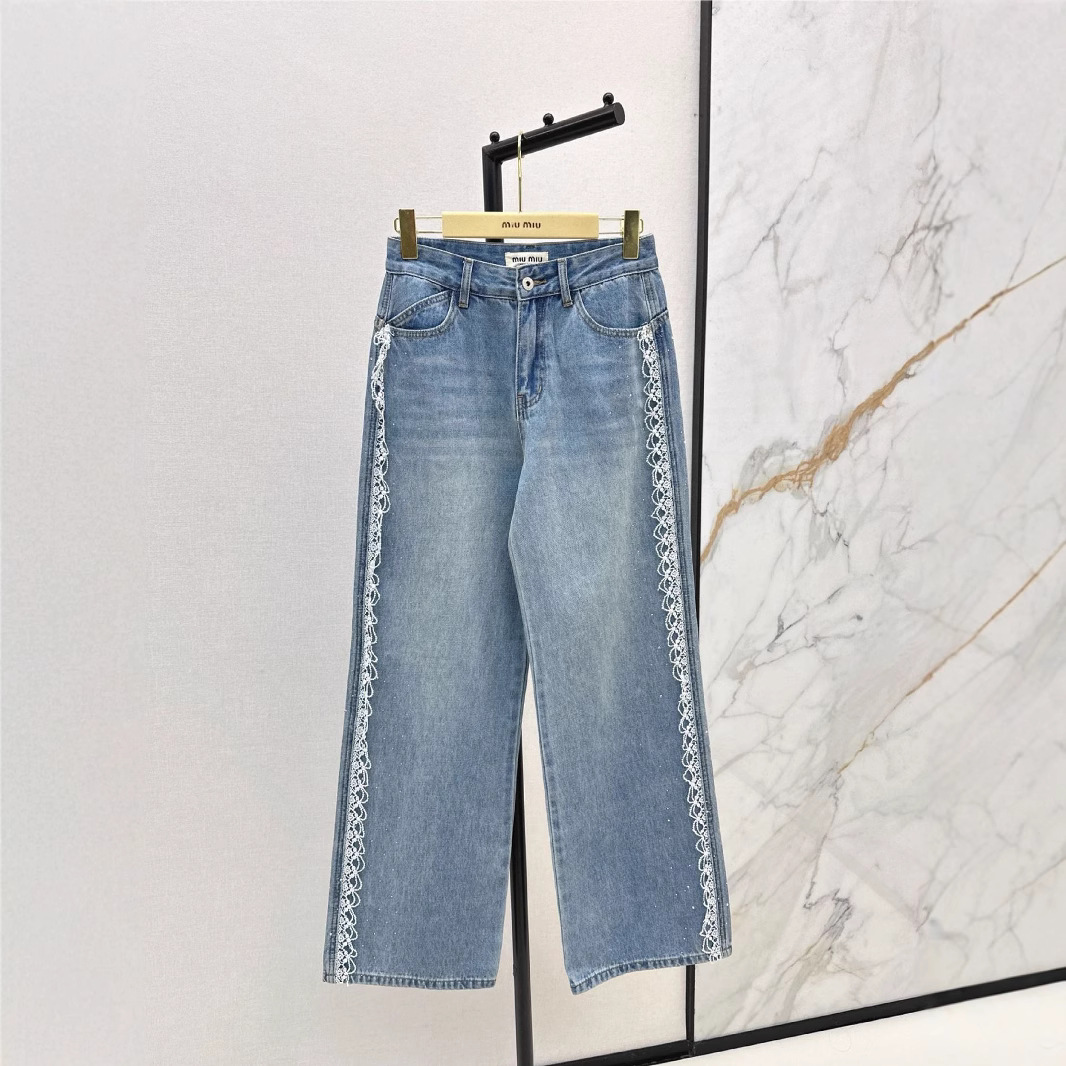 深圳南油25春夏高端女装高腰直筒版型拼接水溶刺绣边烫钻牛仔裤