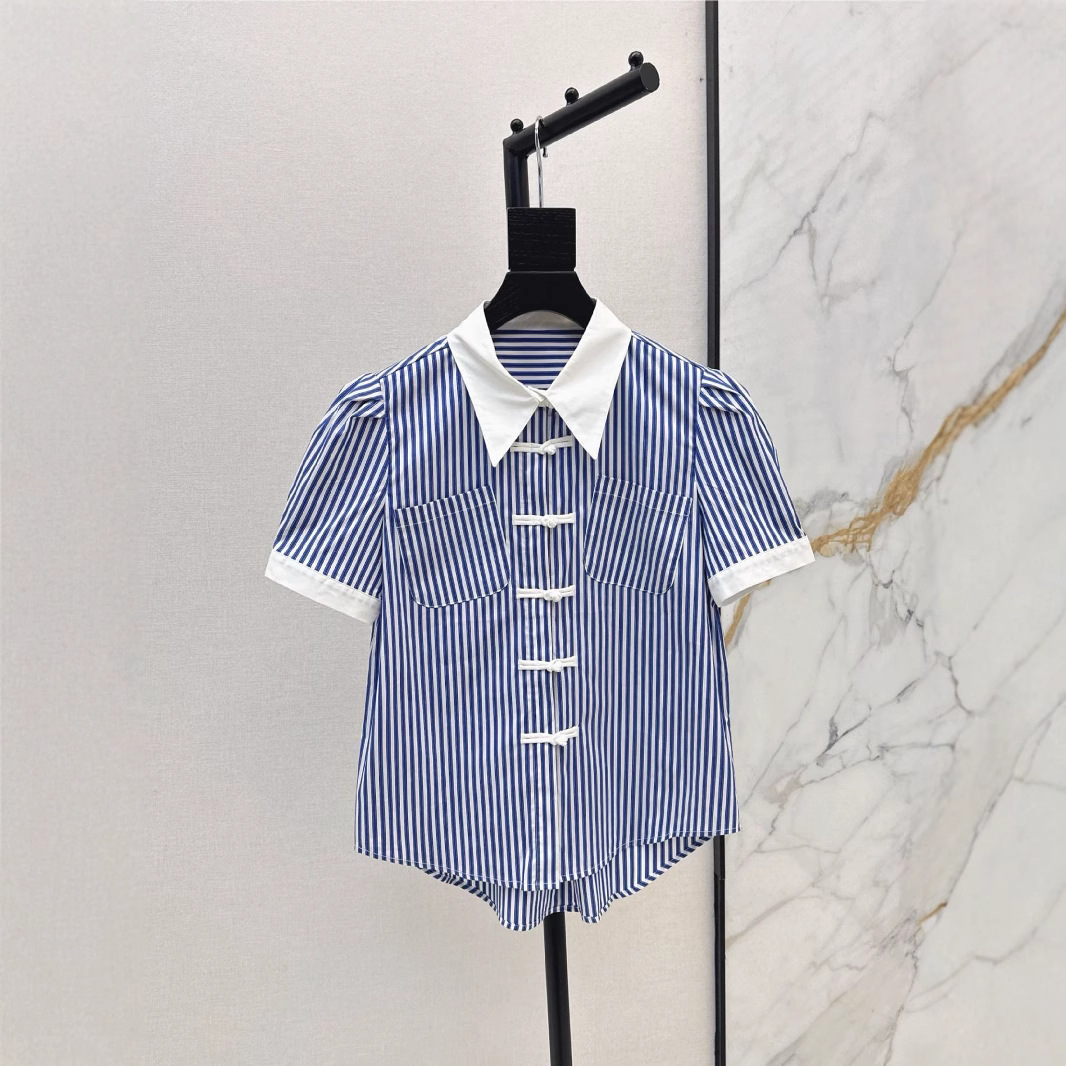 深圳南油25春夏女装 小众设计复古国风盘扣装饰条纹衬衫