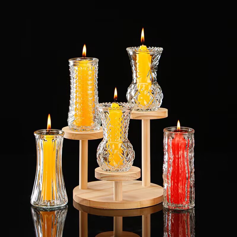 ガラスの燭台の瓶のヨーロッパ式のロマンチックなろうそくの光の夕食のクリスマスのホテルの結婚式の宴会のパーティーのろうそくのコップの空の瓶