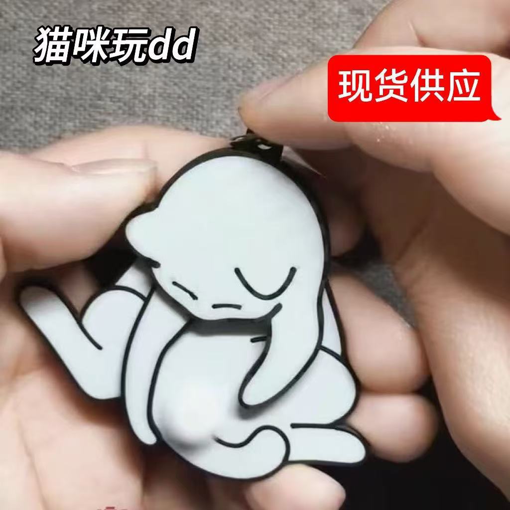 創意的に卵を引っ張って遊んでいます。猫のキーホルダーが可愛いです。