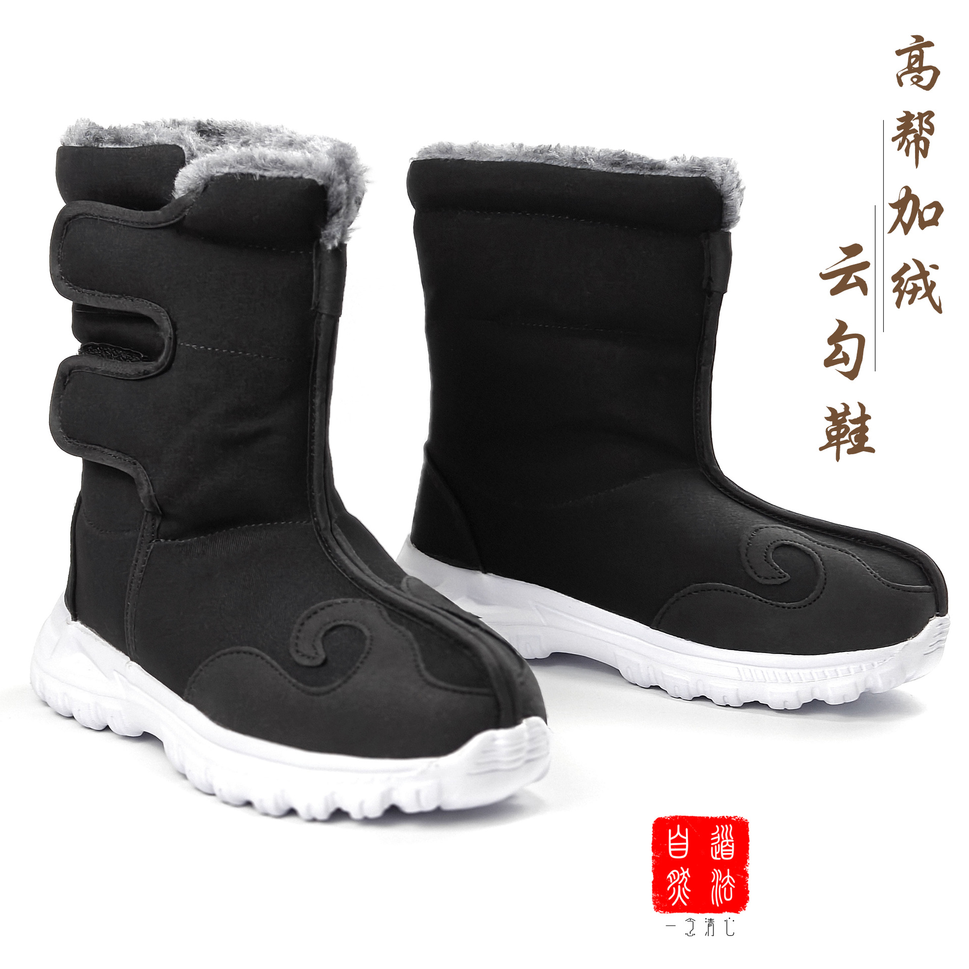 冬の道教道士、男性と女性、ベルベットコットン練習用滑り止め暖かいハイトップブーツ、クラウドフッククラウドヘッドシングルビームシューズ
