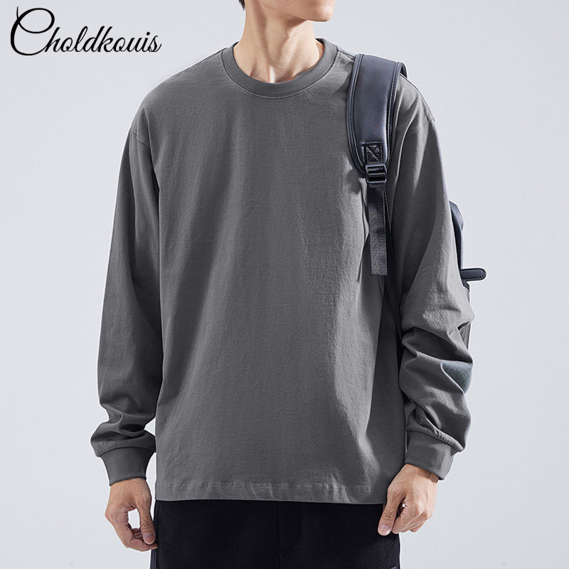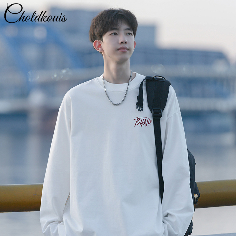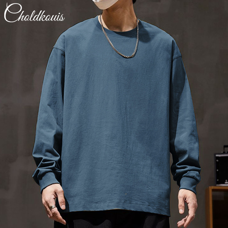 200g重ポンド綿長袖tシャツ男性ゆるいサイズ秋冬新作カジュアルシンプル丸襟シャツ