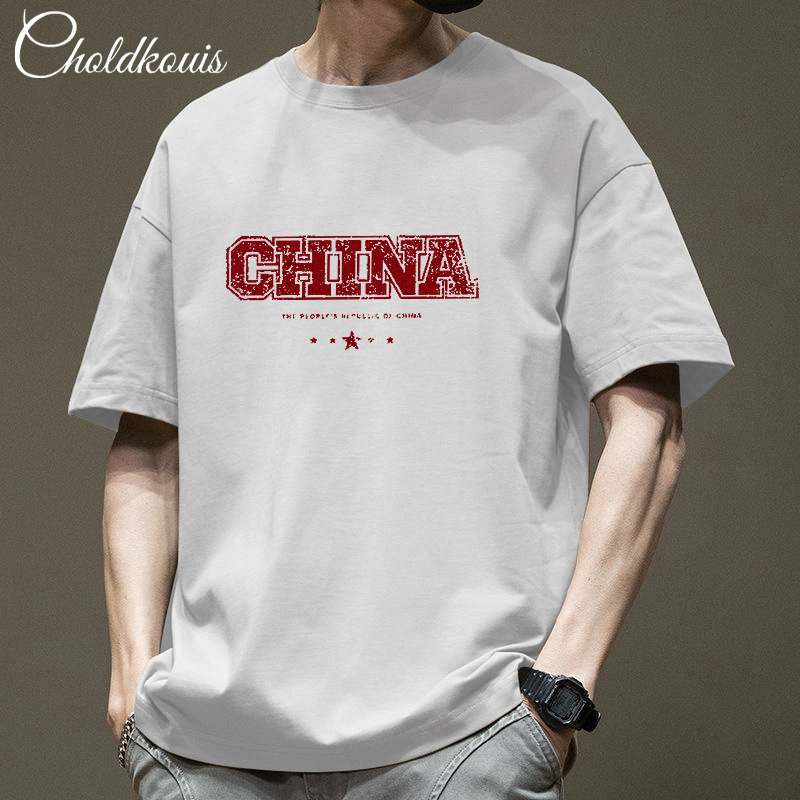 重いポンドの純綿のゆったりしたtシャツの男性のプリントの丸首のファッションのブランドのins半袖のtシャツの男性の韓国版のファッションの半袖の男性のファッション