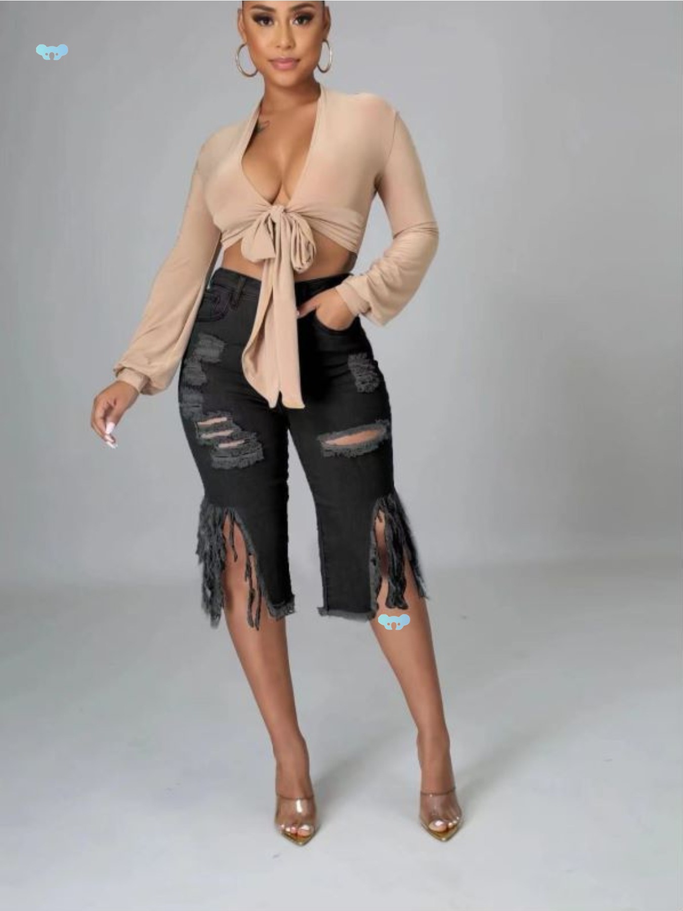 フリンジヘム付きトレンディなダメージデニムショートパンツ ファッションジーンズ