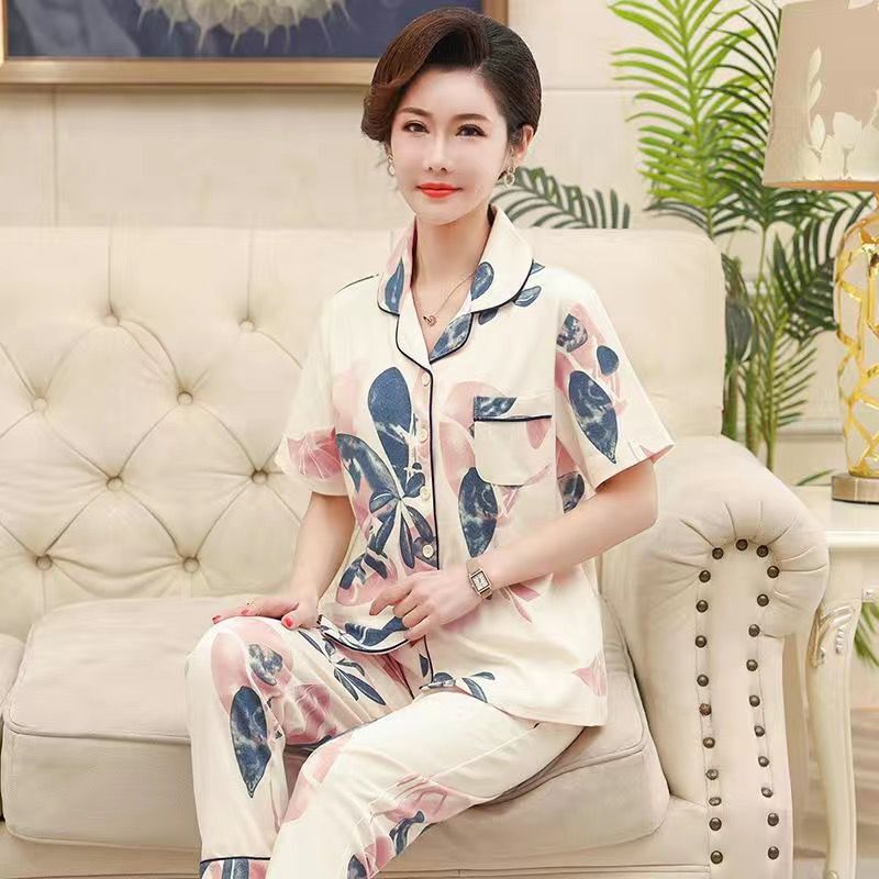 女性用パジャマ、夏、中年母親、純綿半袖ズボン、春と秋の薄手のウェアラブルホーム服セット