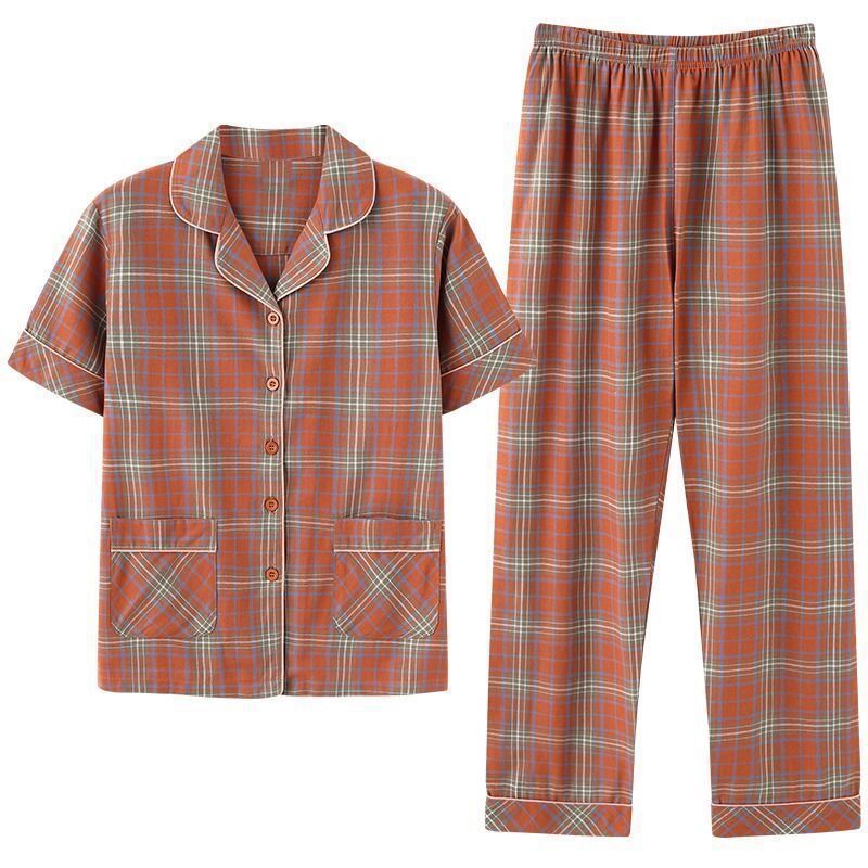 純綿パジャマ女性の夏の新しい半袖春と秋のチェック柄プラスサイズ 100kg 屋外で着用可能ホームウェアセット
