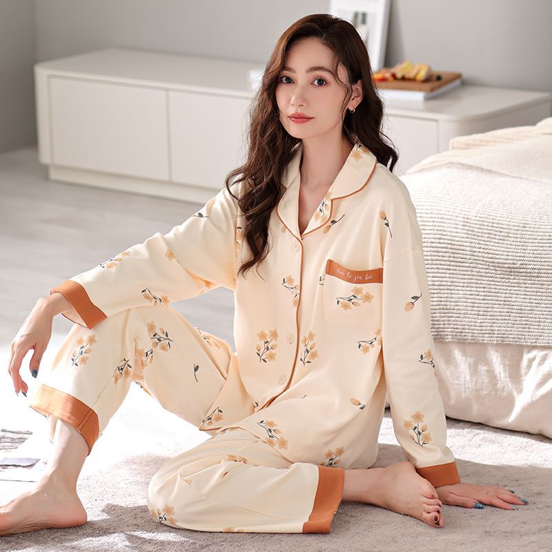 女性用パジャマ、長袖、春夏、薄手、かわいい、小さなラペルカーディガン、純綿産後スーツ、ホーム服