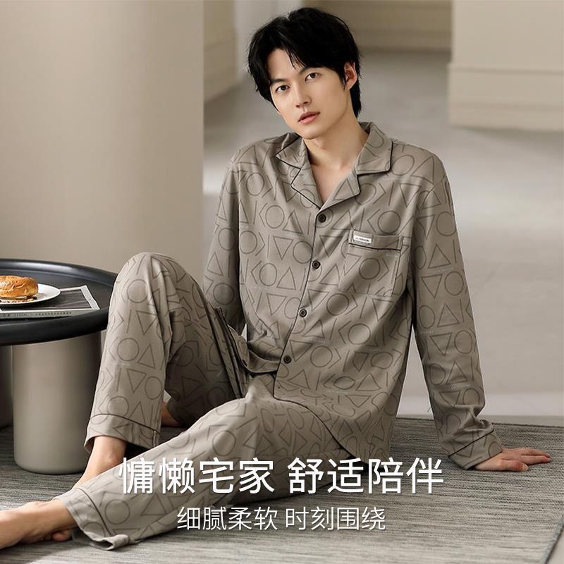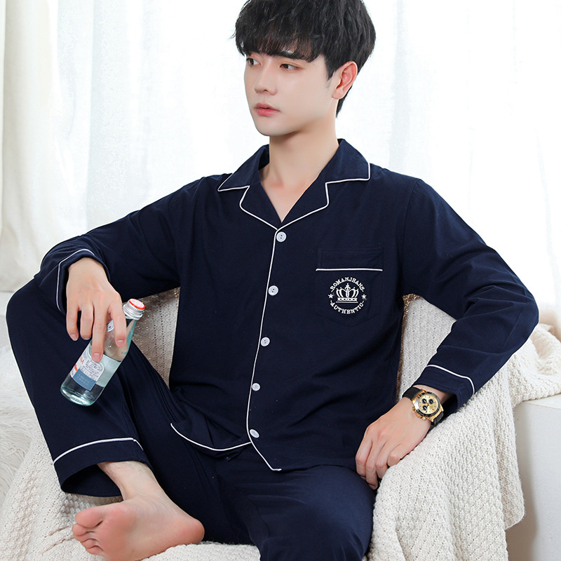 春と秋の男性用パジャマ、純綿長袖メンズプラスサイズユースコットン秋と冬のホーム服は屋外で着用できます