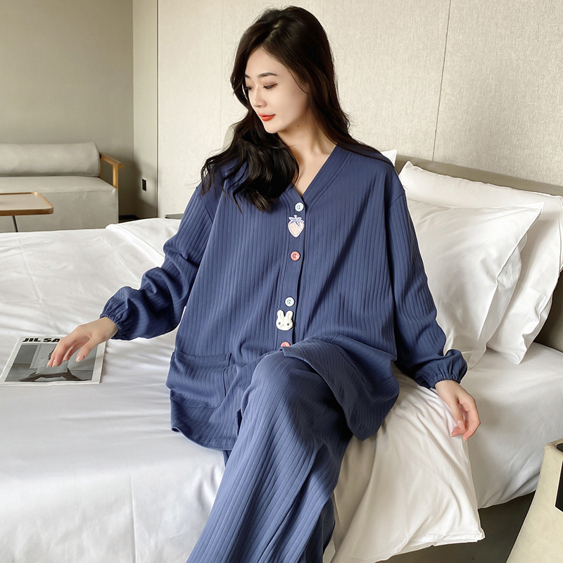 春と秋の女性の薄い長袖パジャマ大きいサイズセット漫画ホーム服長袖ズボンツーピース綿カーディガン