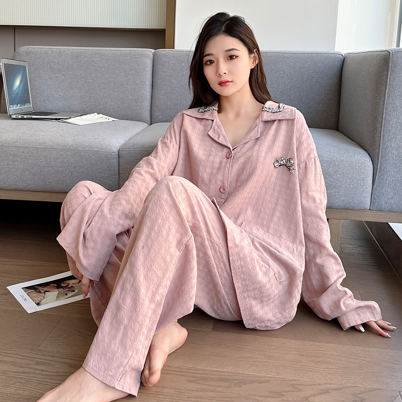 プラスサイズのパジャマレディース長袖ホームウェアセット春と秋の薄いパジャマツーピースセットレディースコットンプリントカーディガン