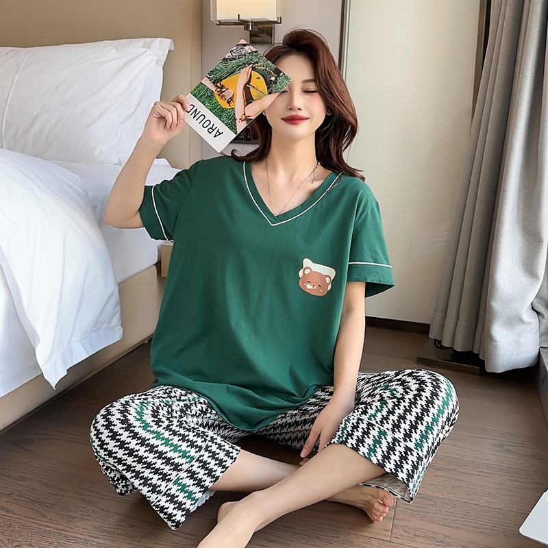 春夏大きいサイズの純綿パジャマ女性の薄いホーム服セット漫画刺繍半袖クロップドパンツ V ネックカーディガン