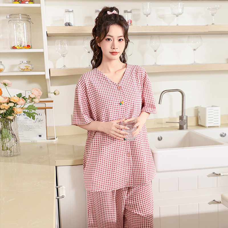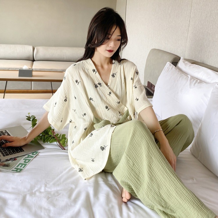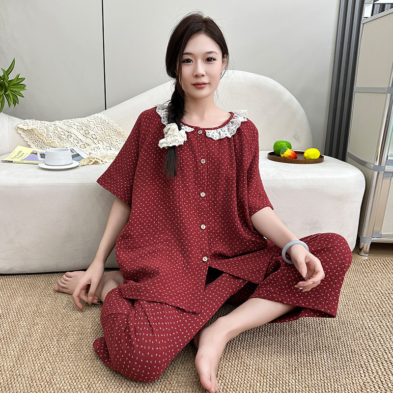 大きいサイズの純綿ガーゼパジャマ 2025 女性の中国風ホーム服薄い半袖クロップドパンツドロップシッピング