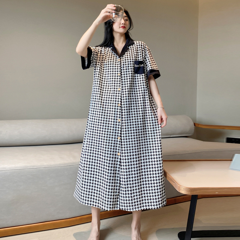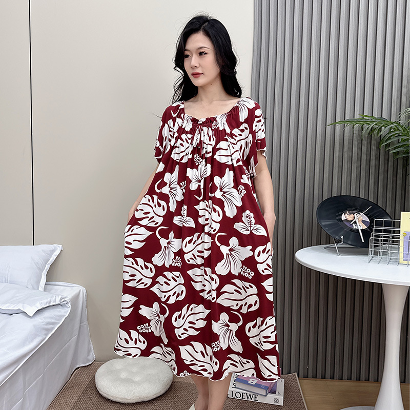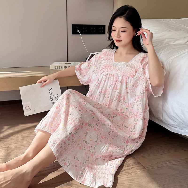 夏の新しい純綿半袖ナイトガウン大きいサイズ二層ガーゼホームスカートミッドレングスプリントカジュアルスカート卸売ドロップシッピング