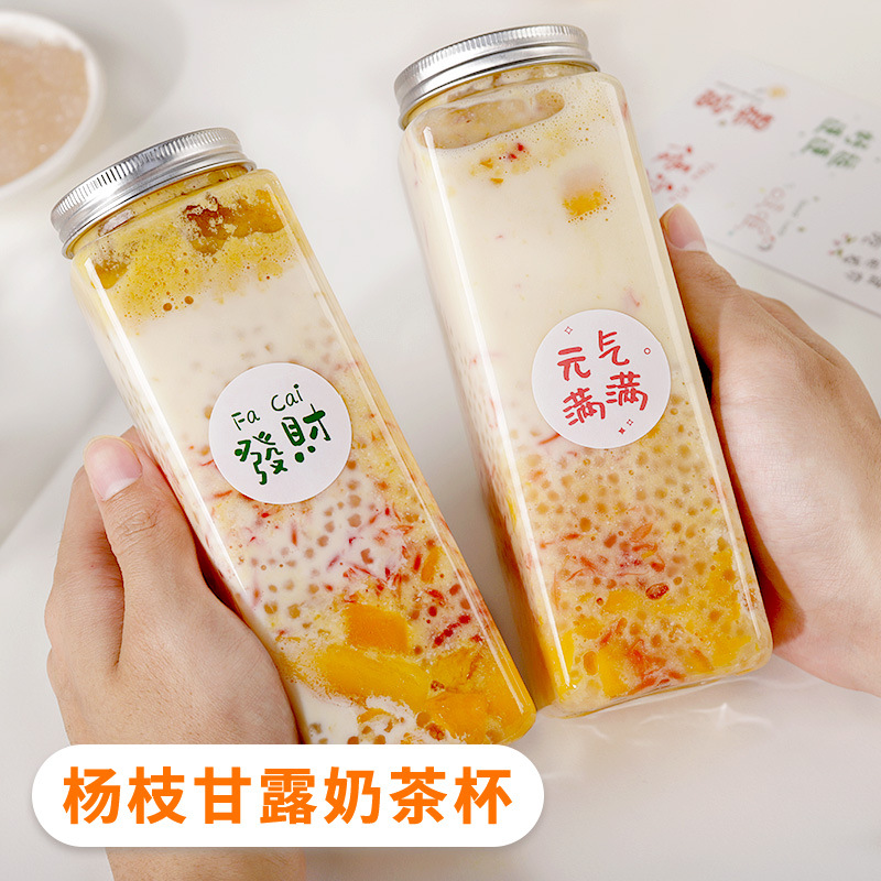 ポプラの花蜜ボトルプラスチックミルクティーカップ使い捨て蓋付き卸売インターネット有名人カップスクエアカップ飲料ジュースカップ商業