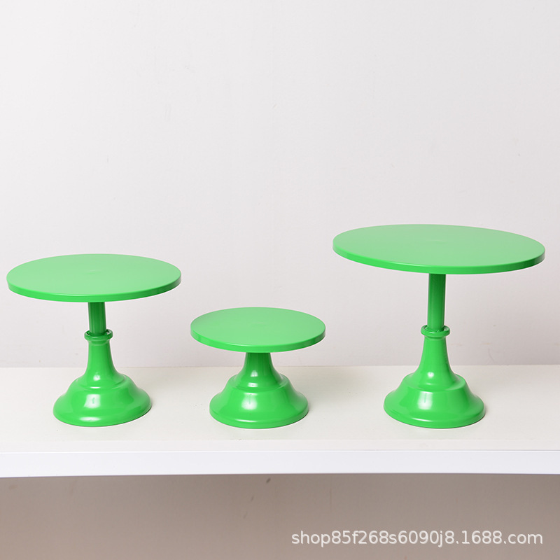 ヨーロッパ式の金属のケーキの棚の3つのセットのデザートのお菓子の高い足の草の緑の結婚祝いの道具のパーティーのケーキのトレーの置物