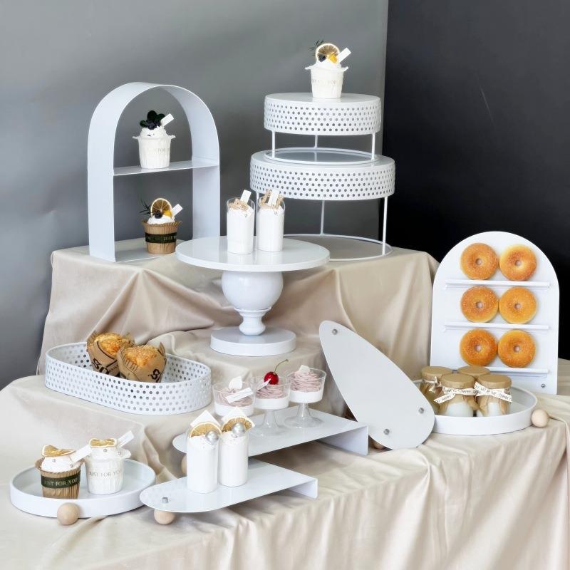 白い鉄芸のデザート台の置物の結婚式の置物の装飾の誕生日ケーキの皿の展示棚の午後のお茶のお菓子のトレー