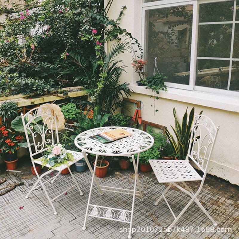 アメリカのレトロな屋外の庭のテーブルと椅子の露天花園の鉄芸は古い喫茶店のレジャーの午後のお茶と椅子の組み合わせをします。