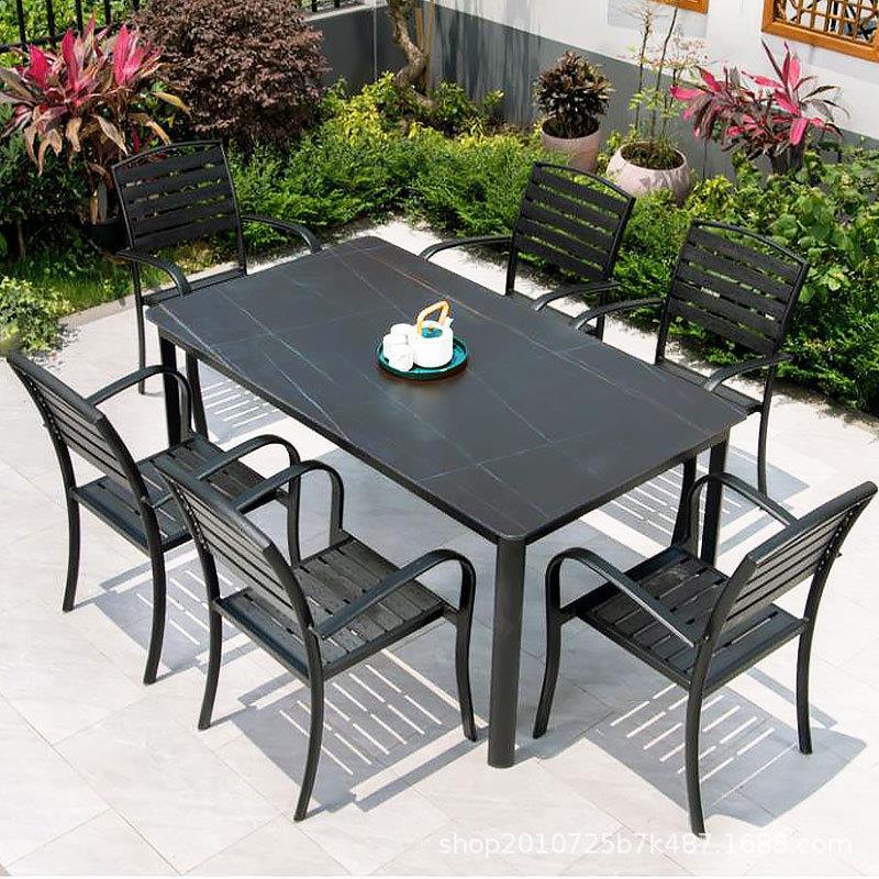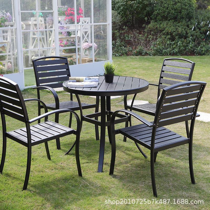 屋外のテーブルと椅子の黒い公園の別荘の喫茶店のミルクティーの店の屋外のベランダの庭の鉄芸のプラスチックの木の日焼け止めのテーブルと椅子