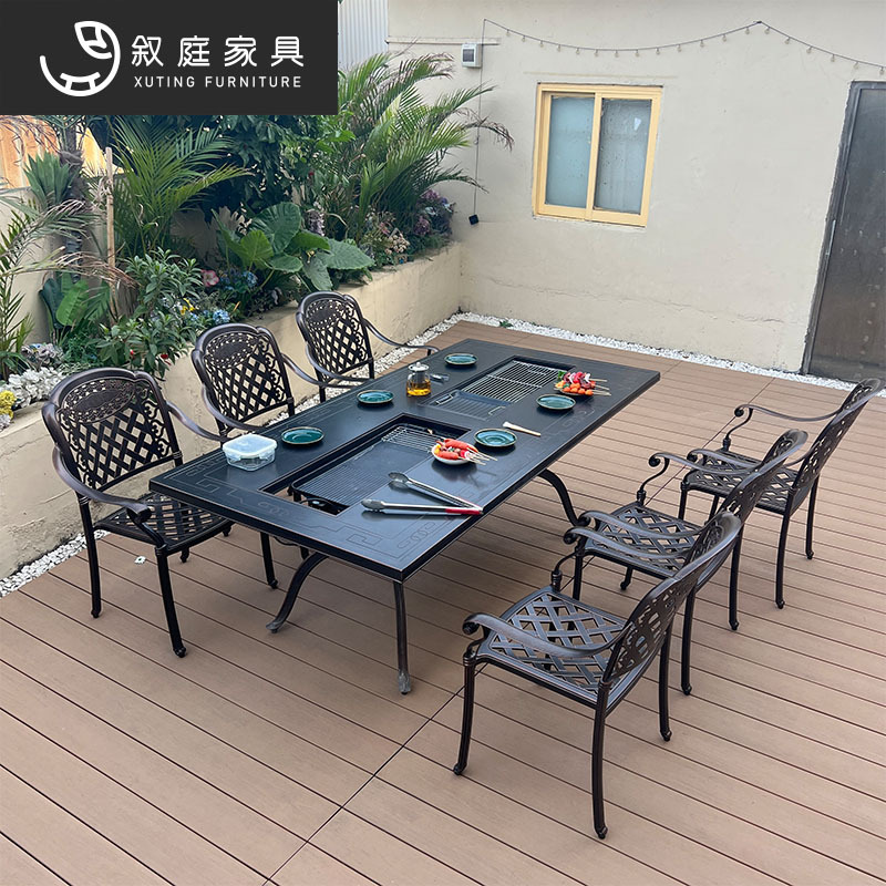 屋外バーベキューテーブルと椅子、中庭の屋外カーボンオーブン、ヴィラガーデンレジャー家庭用ヨーロピアンスタイル屋外鋳造アルミニウム電気グリルテーブル