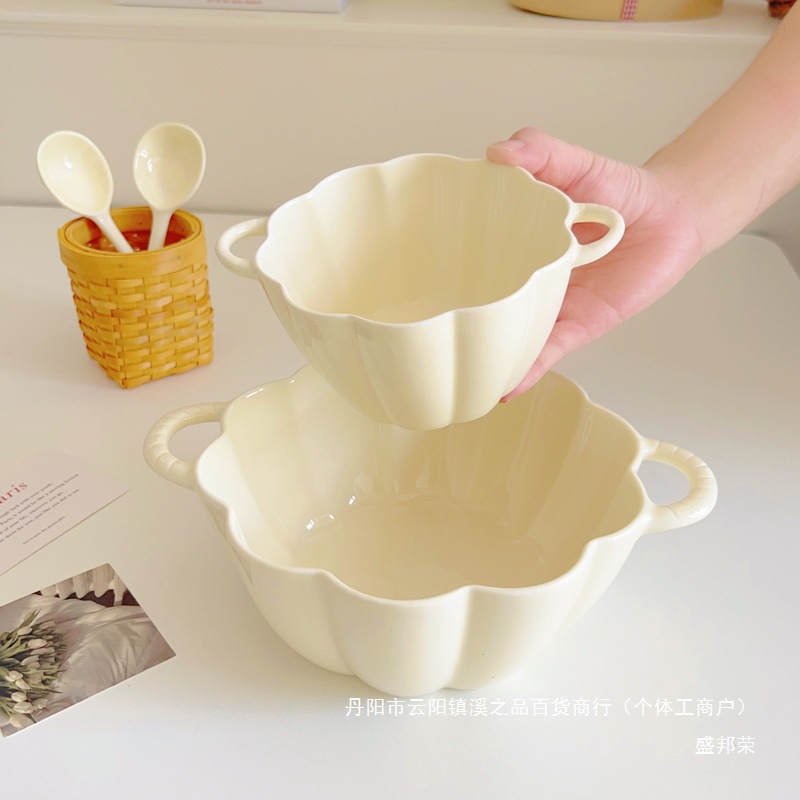 可愛い陶器製の両耳付きかぼちゃ型ボウル、女子力満載、寮のインスタ映えする麺類用ボウル、釉下彩食器