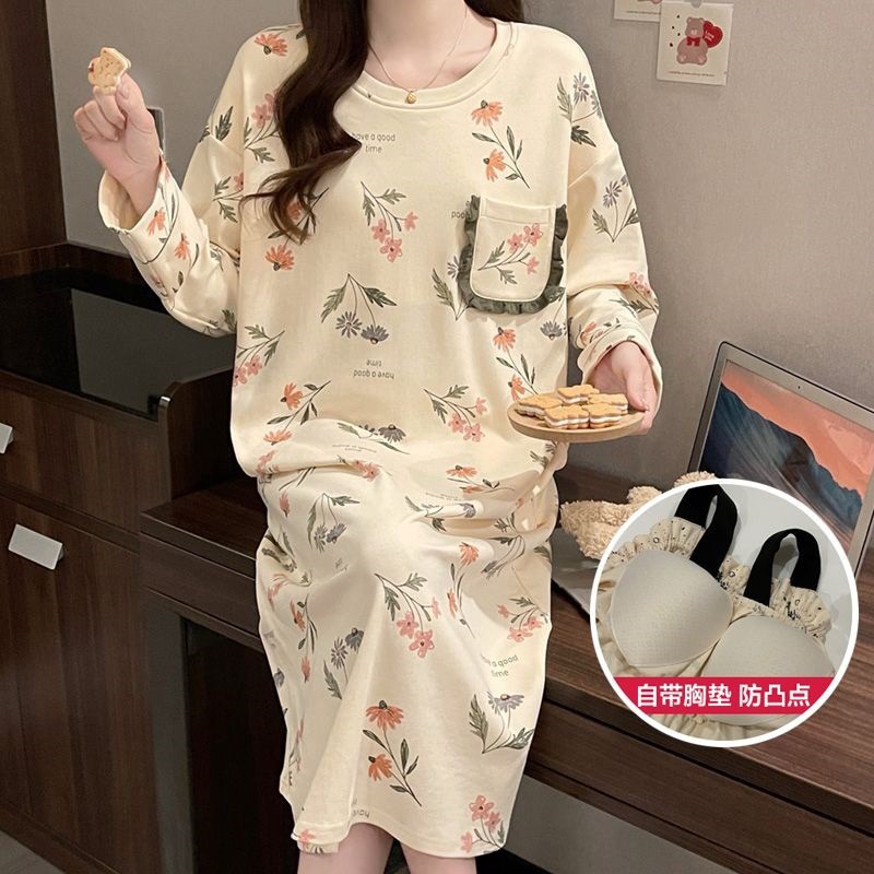 胸パッド付きの寝スカート女性春と秋の綿の女性の長袖のワンピースの少女のかわいいゆったりした部屋の服の秋の冬