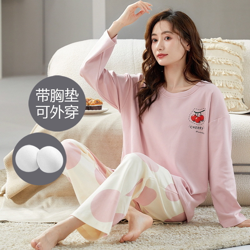 胸パッド付き春秋綿パジャマ女性長袖ins風学生少女ホームウェア外着セット秋冬
