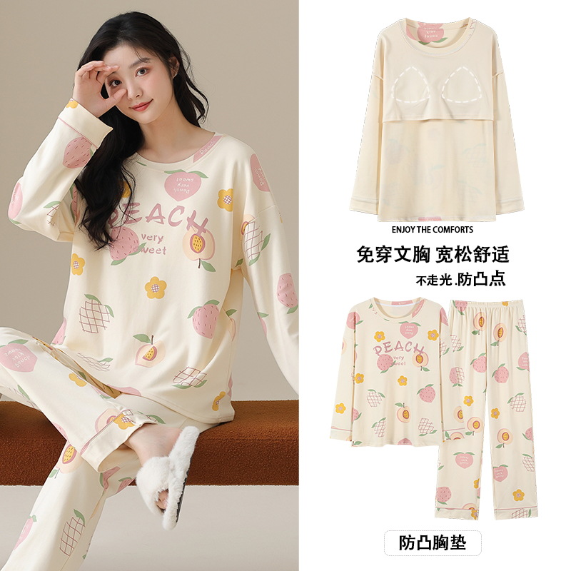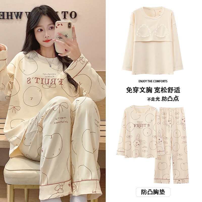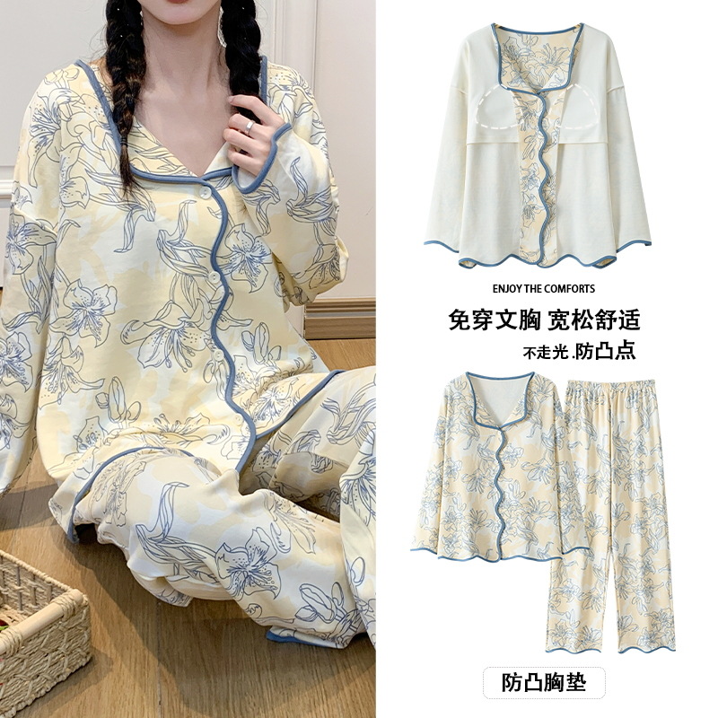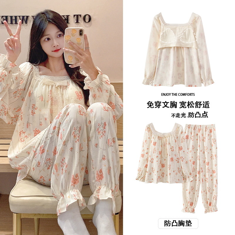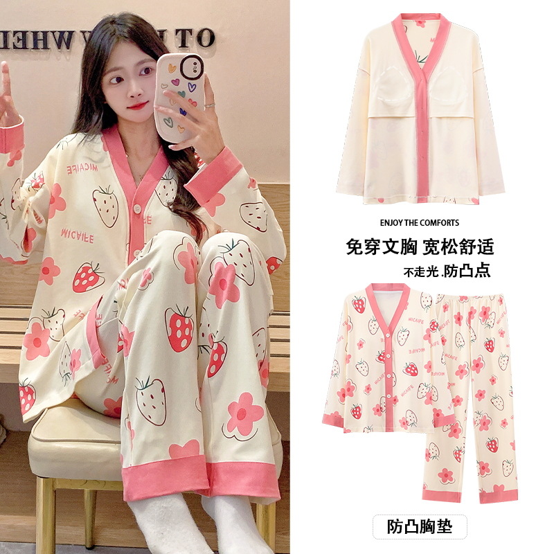 胸パッド付きパジャマ女性春と秋の雲綿長袖カーディガン甘くて可愛い女性ホームウェアセット秋冬