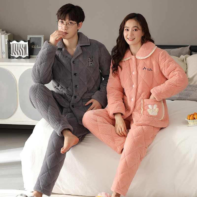 冬のカップルは綿のコーラルベルベットのカーディガンを挟んで、家の服を厚くして、男性の女性の冬のパジャマセットを温めます。