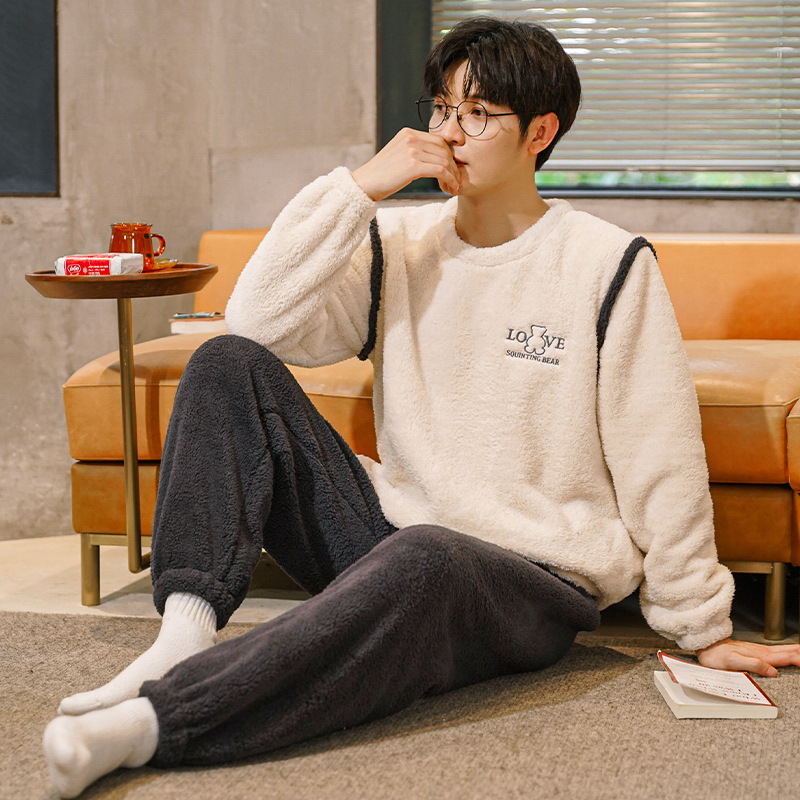 秋冬の男性フランネルのパジャマセットサンゴのベルベットの保温学生のレジャーとベルベットの厚い冬の家庭服