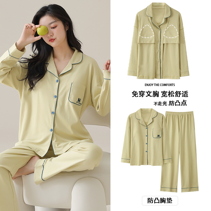 春秋レディースカーディガンパジャマ長袖長ズボン胸付マットセット少女ゆるい綿質秋冬ホームウェア