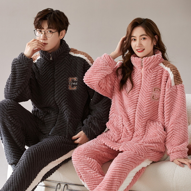 カップル秋冬ジッパーカーディガンフランネルパジャマ男性女性ベルベット厚いコーラルベルベット家庭服セット