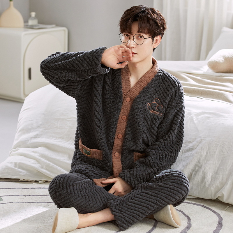 秋冬の男性フランネルのカーディガンのパジャマはシンプルでゆったりしています。