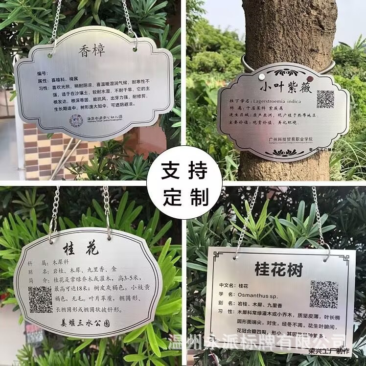ステンレス製の木札、植物や木の識別標識、案内標識、庭園や果樹の吊り下げ標識の製作、耐摩耗性