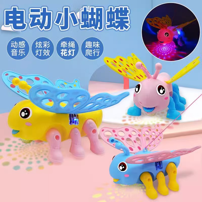 赤ちゃんの電動爬行蝶が屋台を並べて光る音楽の縄を引く蝶の子供の益智のおもちゃの屋台は夜市を卸売りします。