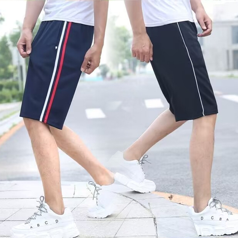 学生用のストライプ付き学生服パンツとショートパンツ、2本のストライプ付きのカジュアルでゆったりとした夏用の伸縮性のあるスポーツパンツ、男性と女性用の5分丈パンツ