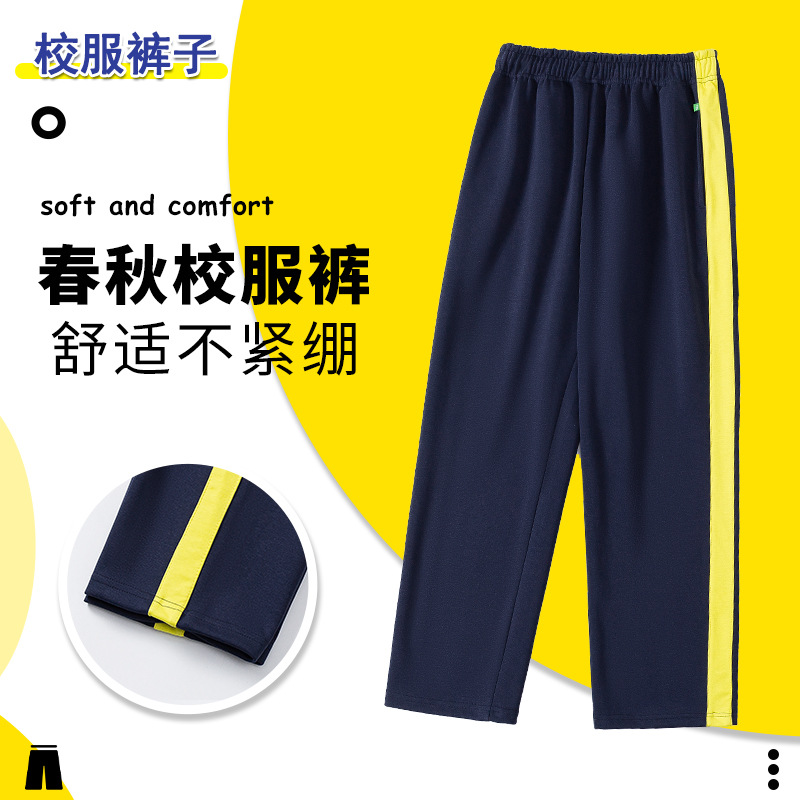 グレーの学生服パンツ、2本のストライプ、反射ストライプ、青いストライプ、春と秋のスタイル、高校生と小学生のスクールパンツ、夏の薄いアイスシルク