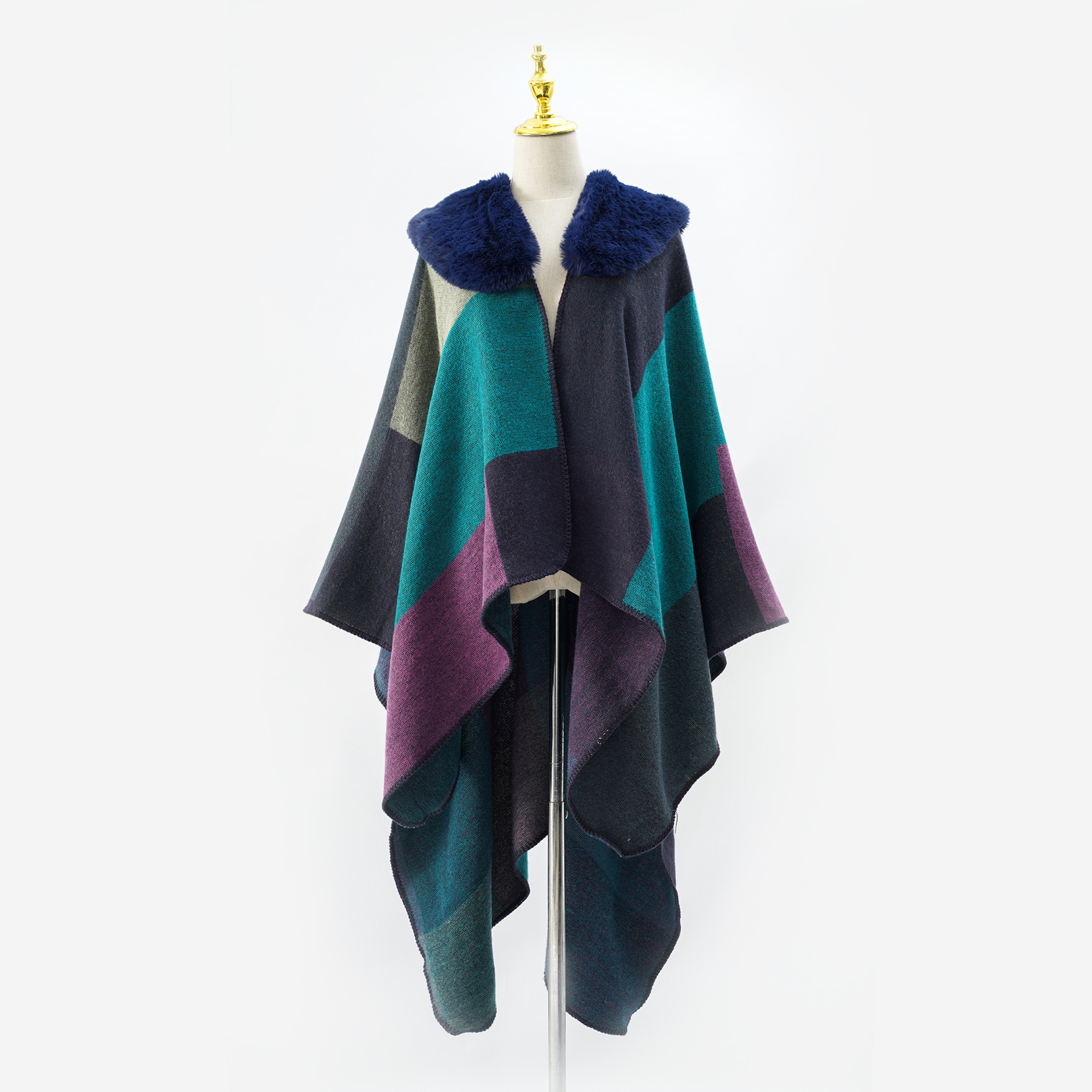 女性の集まりの青い毛の襟の格子の貴婦人はマントのストールの新型の保温の秋冬を着ます。