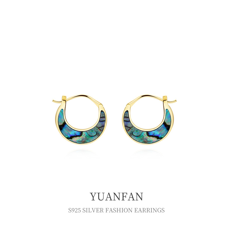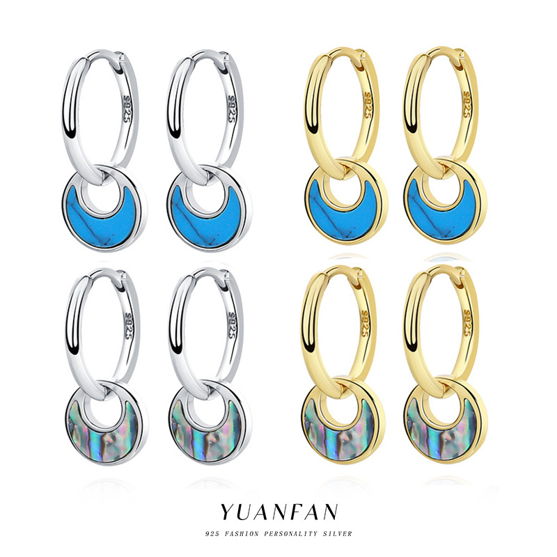 遠梵香925純銀レトロなアワビの貝殻の三日月のイヤリングの女性の小さい大衆の円形の緑の松石の耳は対外貿易の現物を掛けます。