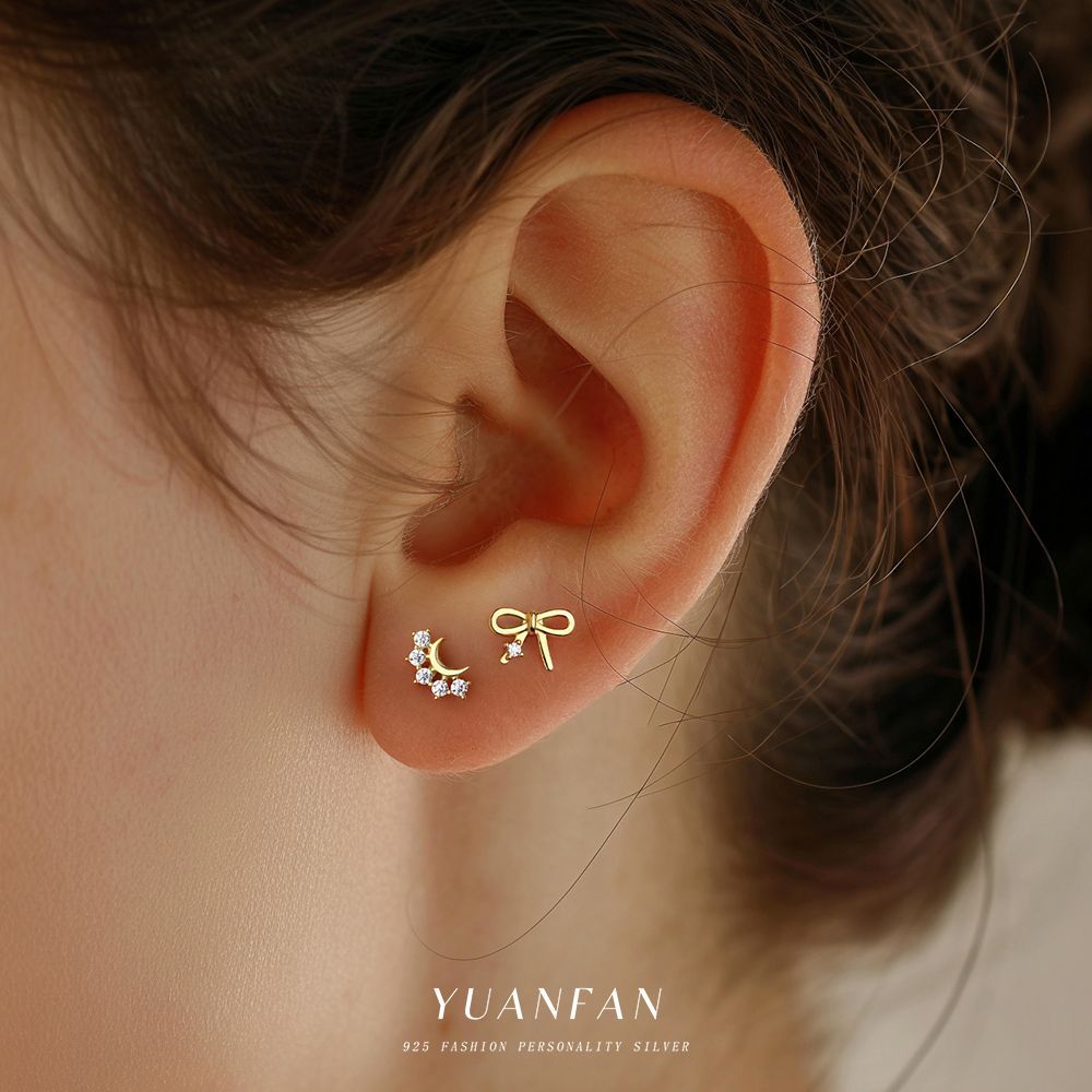 遠梵s925純銀フランス国境を越えたジルコンピアス女性星月蝶ネクタイが洗練されたファッション欧米耳飾り