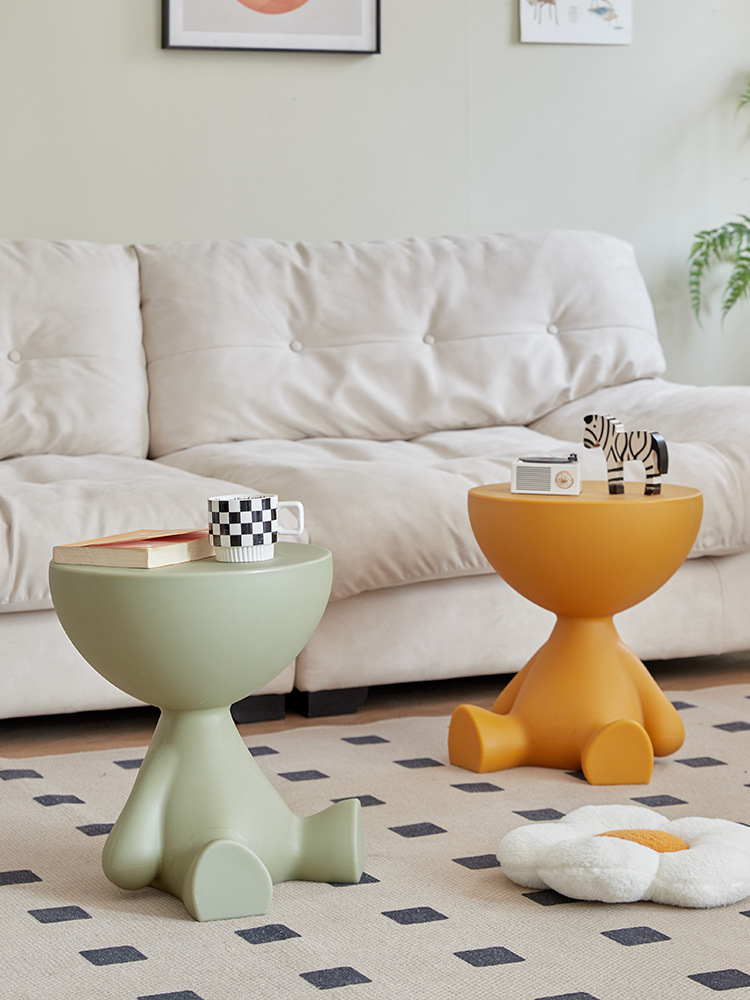 クリエイティブな小さなフラットヘッドコーヒーテーブル、クリームスタイルのリビングルーム、シンプルな横たわるフラットサイドテーブル、デザイナーソファの横にある家の装飾