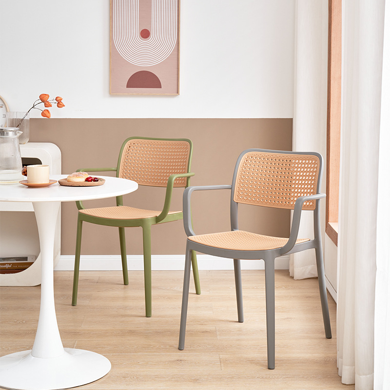 北欧のシンプルなプラスチック製の椅子、肘掛け付き背もたれスツール、厚みのある積み重ね可能なダイニングテーブルと椅子、ホーンの屋外籐椅子