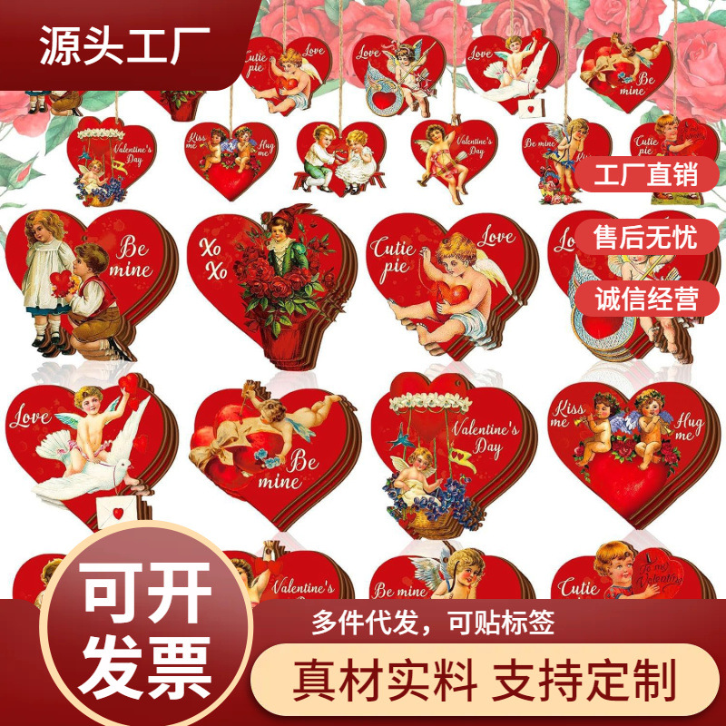 レトロなバレンタインデーの装飾品の木の装飾品の天使の心の愛の木の透かし彫りの田舎の農舎のバレンタインデーの木の装飾