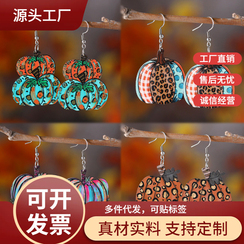 アマゾンクロスボーダー新作感謝祭秋豊作ヒョウ柄かぼちゃペンダントイヤリング木製耳飾り