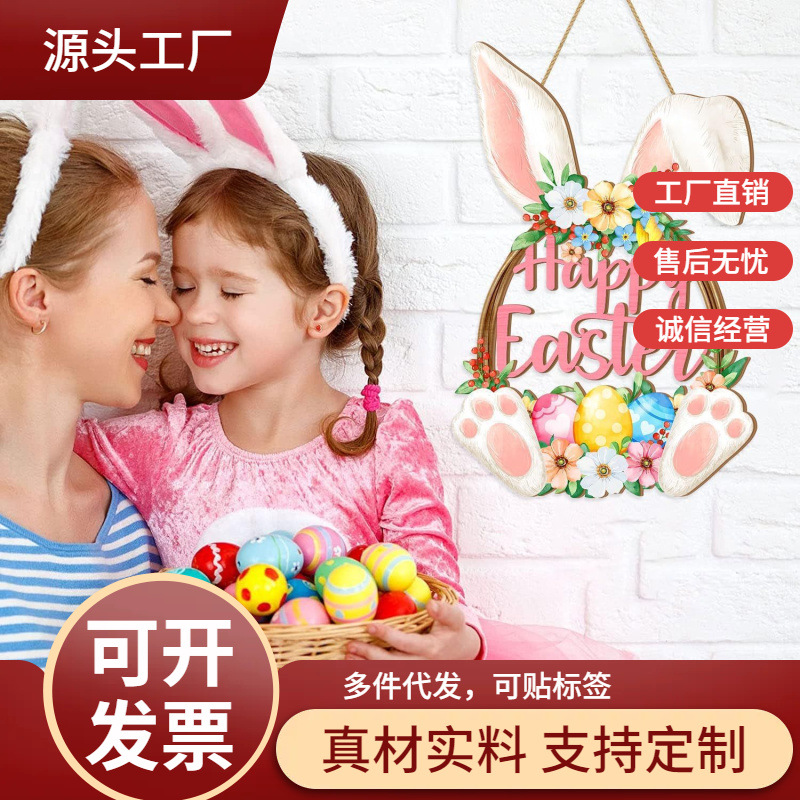 クロスボーダーtemu新しいイースターウサギ木製表札カラフルな卵花飾り付きハッピーイースター壁掛け
