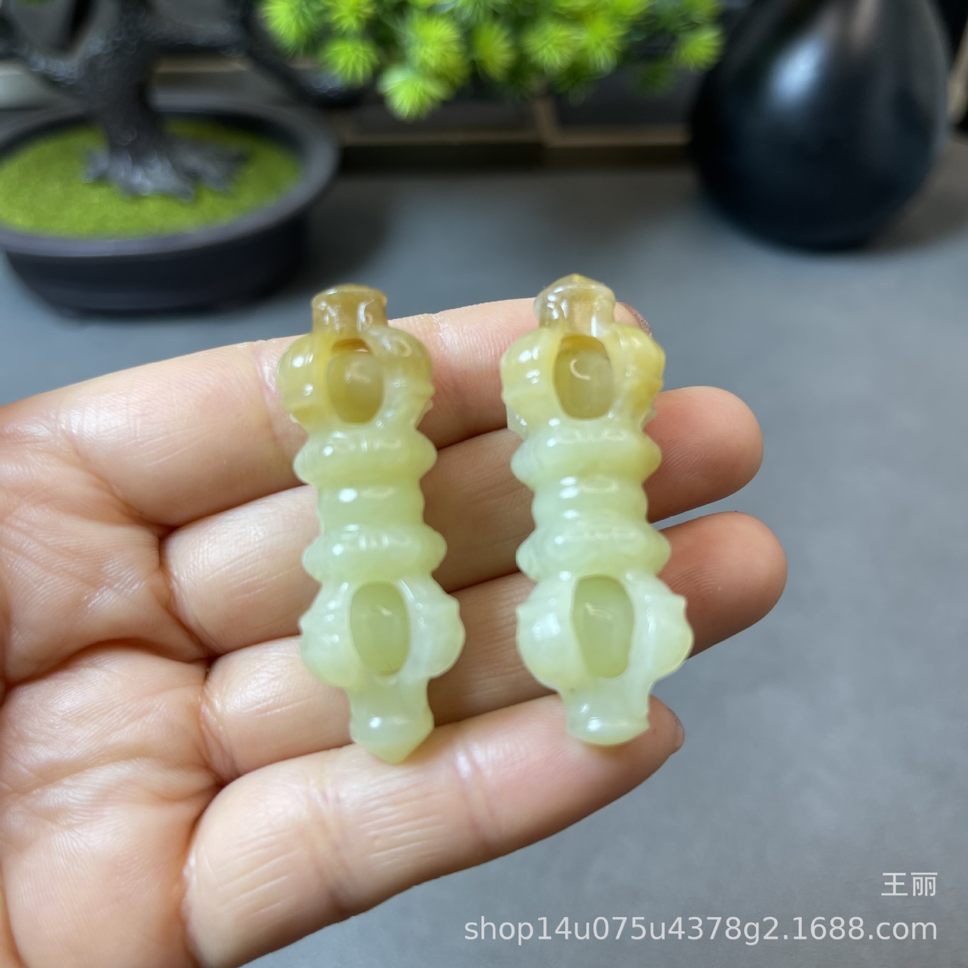 新疆と田玉の砂糖の材料の黄口の透かし彫りのペンダントの男女の金のかわいい玉の緑色の降魔の杵のペンダント