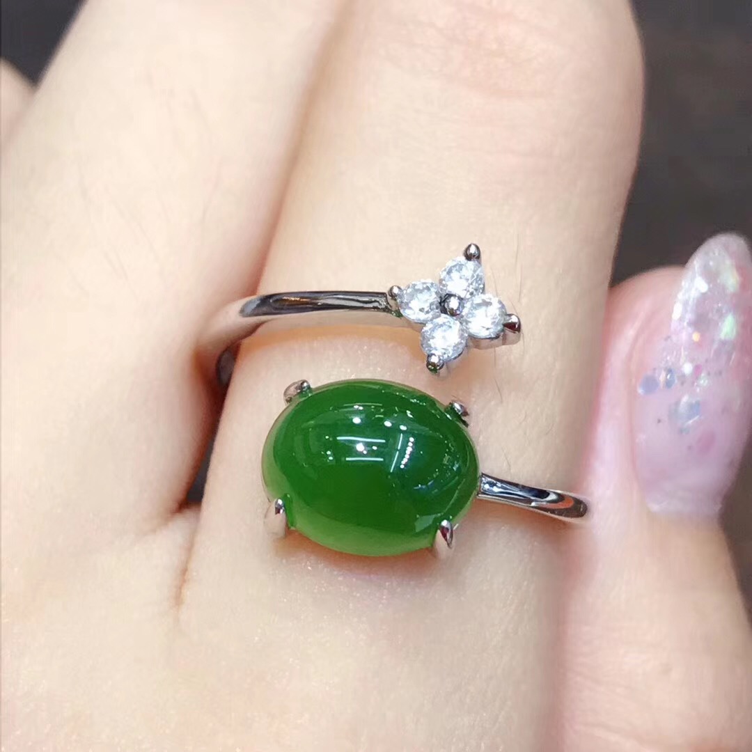 新疆と田玉碧玉指輪の女性金925銀はホウレンソウの緑玉玉器の指輪をはめ込んでいます。