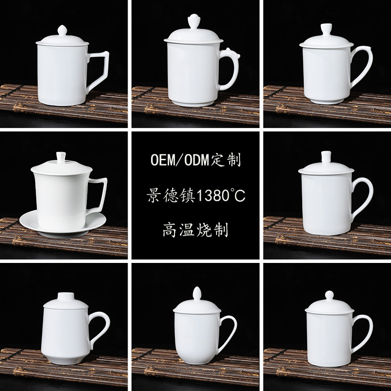 景徳鎮高白泥オフィスカップ白磁ビジネス会議カップ高温焼成陶磁器カップ純白蓋付きカップ