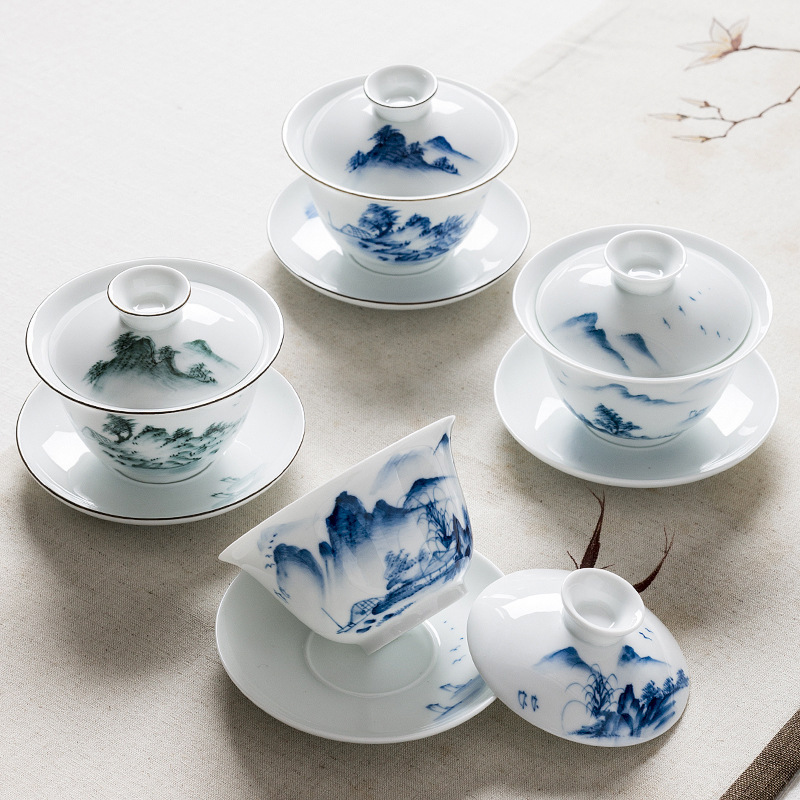 景徳鎮の手描きの蓋の碗の釉薬の下で白い磁器の蓋の碗の青と花の山水の蓋の碗の3才の茶碗の卸売りの工夫の茶器